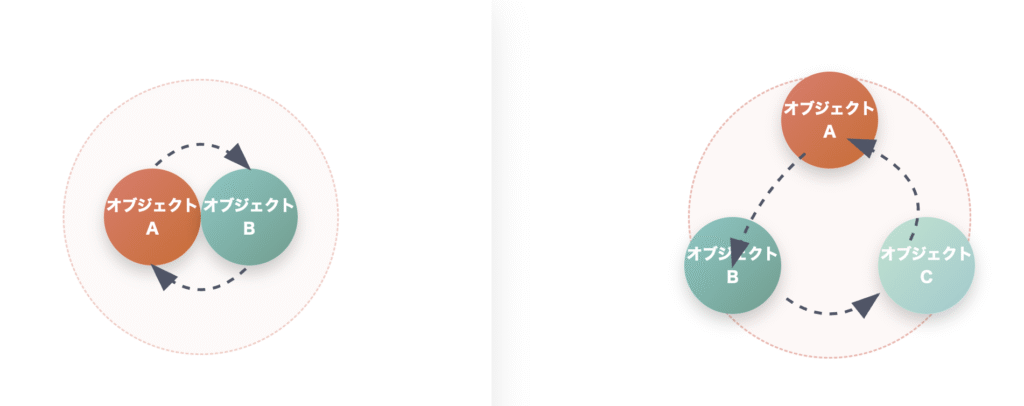 ObjectAはObjectBを保持し、ObjectBはObjectAを保持するというようにお互いのクラスを参照し合っています。これを循環参照といいます。