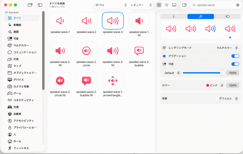 SF Symbolでどのような可変色の指定が可能か確認する事ができます。