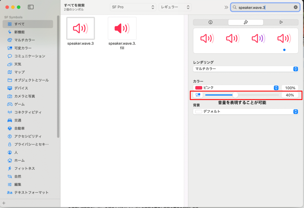例)「speaker.wave.3」で可変色を設定することによりボリューム値を表現することができます。