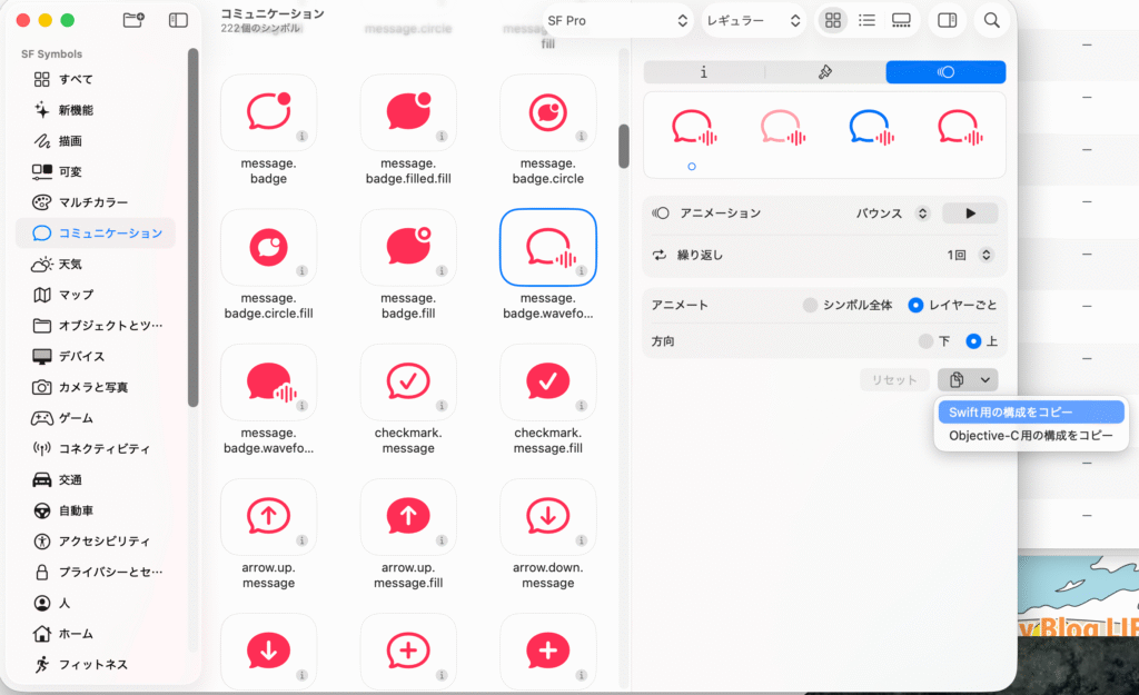 指定する値は、SF Symbolsのアニメーション設定画面の右下にある「コピー」アイコンから「Swift用の構成をコピー」を選択するアニメーション用の指定値が取得できるので、その値をアニメーションをさせいたいIconのコードに続きに貼り付ける事でコード記述完了します。